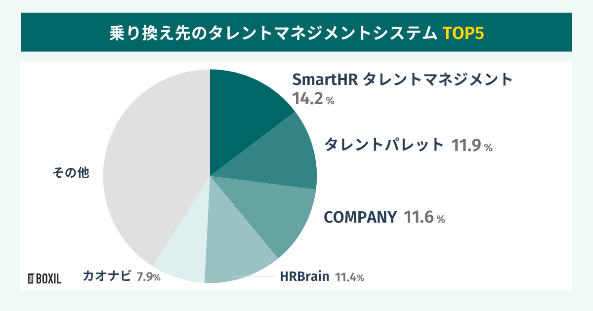 乗り換え先のタレントマネジメントシステムは「SmartHRタレントマネジメント」が14.2%で最多となり、次いで「タレントパレット」が11.9%、「COMPANY」が11.6%、「HRBrain」が11.4%、「カオナビ」が7.9%と続いた。
