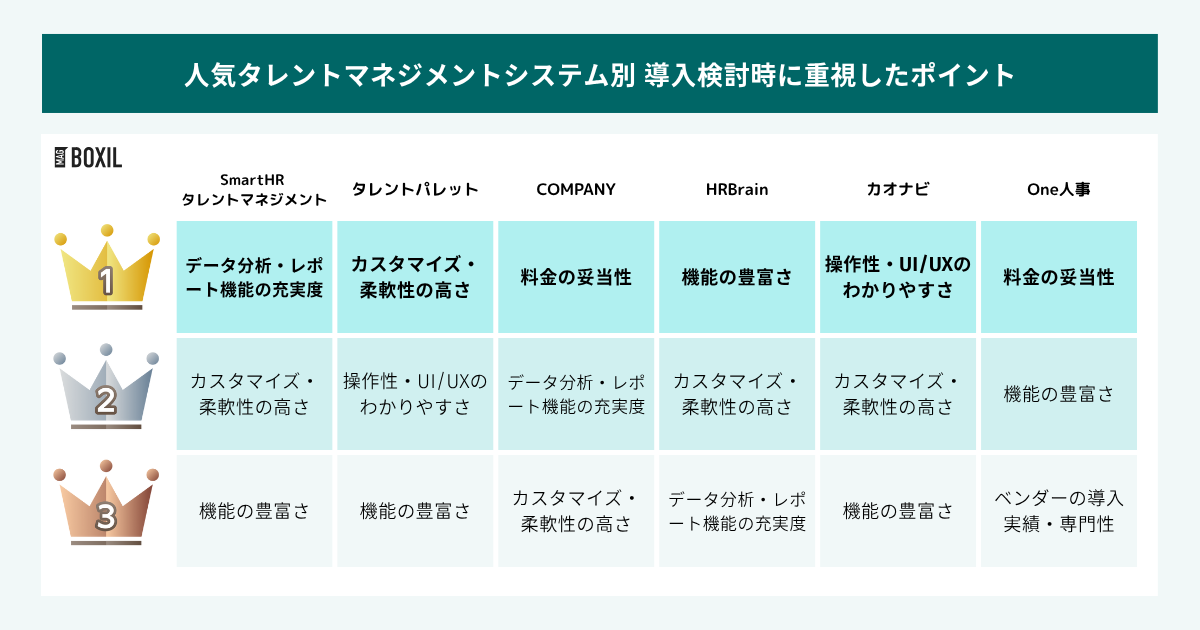 また、乗り換え先を選定する際に重視したポイントを聞いたところ、SmartHRタレントマネジメントでは「データ分析・レポート機能の充実度」、タレントパレットは「カスタマイズ・柔軟性の高さ」、COMPANYは「料金の妥当性」が最も評価され、サービスごとの特徴が現れる結果となった。