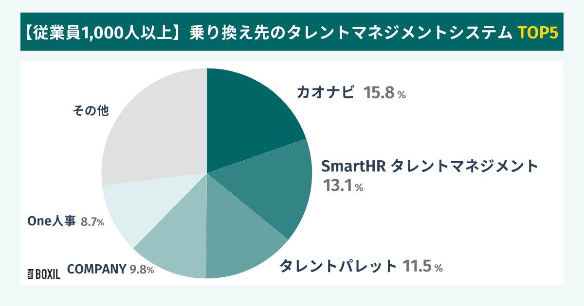 従業員1000人以上の大企業に対し、乗り換え先のシステムを聞いたところ、最も多かったのが「カオナビ」で15.6%、「SmartHRタレントマネジメント」が13.1%、「タレントパレット」が11.5%、「COMPANY Talent Management シリーズ」が9.8%、「One人事」が8.7%と続いた。