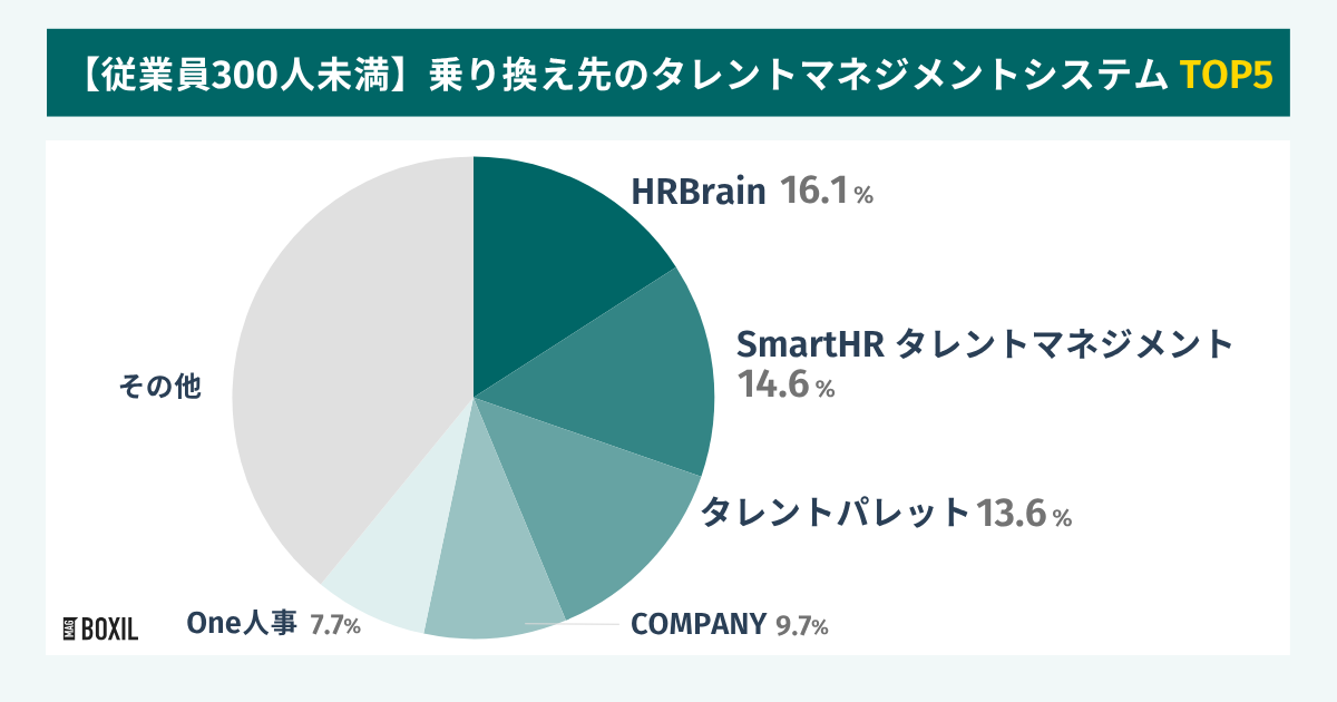 従業員300人未満の中小企業に対し、システムの乗り換え先を質問したところ、「HRBrain」が16.1%で最多となり、次いで「SmartHRタレントマネジメント」が14.6%、「タレントパレット」が13.6%、「COMPANY Talent Management シリーズ」が9.7%、「One人事」が7.7%と続いた。