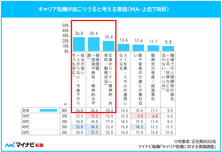 キャリア危機が起こりうる要因は「給与が低い」「健康問題」「仕事がハード」がトップ