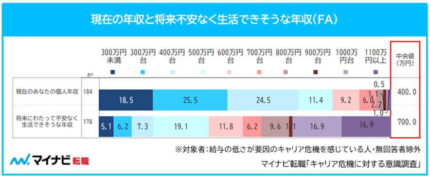 キャリア危機が起こりうる要因に「給与の低さ」をあげた人に現在の年収を聞くと、中央値は「400万円」だった。一方、将来不安なく生活できそうな年収を聞くと、中央値は「700万円」となり、現実と300万円のギャップがあることが分かった。このギャップが、今の仕事を続けていくことへの不安となっているおそれがあるという。