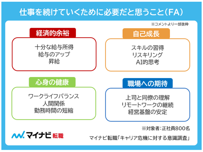 さまざまなキャリア危機意識を持つなかで、安定して仕事を続けていくために必要なものを聞いたところ、「十分な給与所得」「昇給」などの経済的安定、「スキルの習得」「AI的思考」などの自己成長、「ワーク・ライフ・バランス」「人間関係」などの心身の健康に関する意見が多く見られた。また、「上司と同僚の理解」や「リモートワークの継続」など職場へ期待する声も目立った。