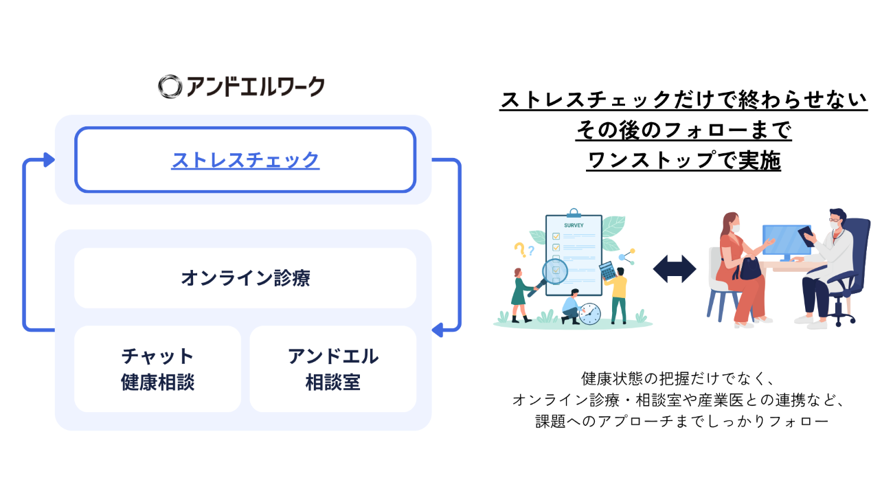 ストレスチェックの結果、専門的な相談が必要な場合は、「アンドエル相談室」でのカウンセリングやチャット健康相談サービスを利用できる。また、ストレスチェック実施者・高ストレス者に対し、産業医・面談担当医の紹介も可能。全国複数拠点がある・リモートメンバーがいるなどの場合でもオンライン面談にて対応できる(有料オプション)。