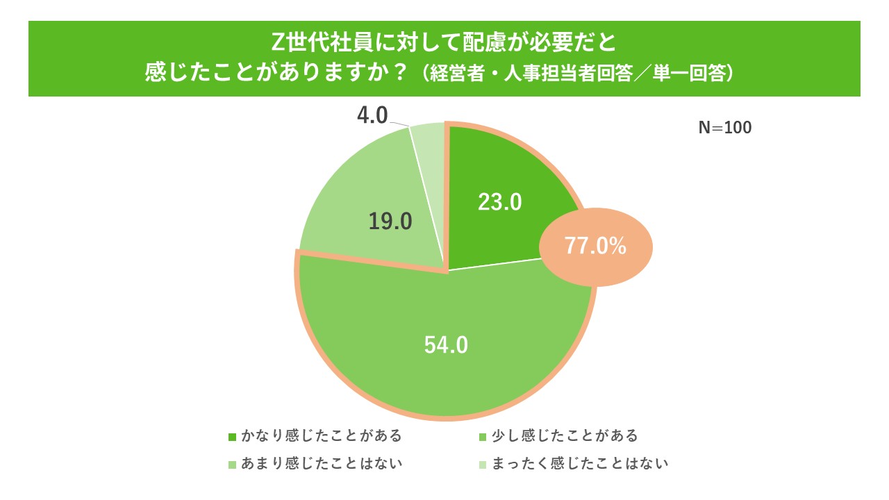 経営者・人事担当者側に対し、Z世代社員に対して配慮が必要だと感じたことがあるかを聞いたところ、「かなり感じたことがある」と「少し感じたことがある」を合わせて77.0%と、多くの企業がZ世代社員に対して配慮の必要性を感じていると分かった。
