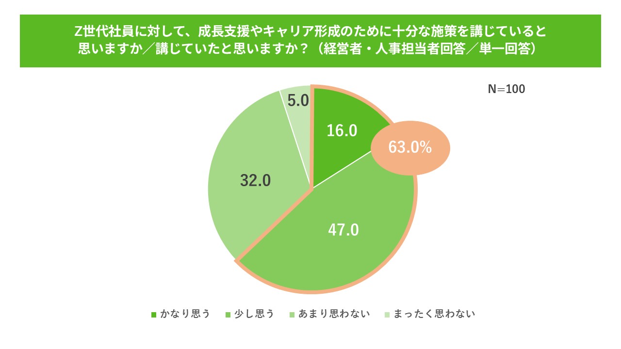 対して経営者・人事担当者側に、Z世代社員への成長支援やキャリア形成のために十分な施策を講じられているかを聞いたところ、「かなり思う」と「少し思う」を合わせると63.0%となった。会社が講じている施策に対し、必ずしもZ世代社員が満足しているとは言えない状況が浮き彫りになっている。