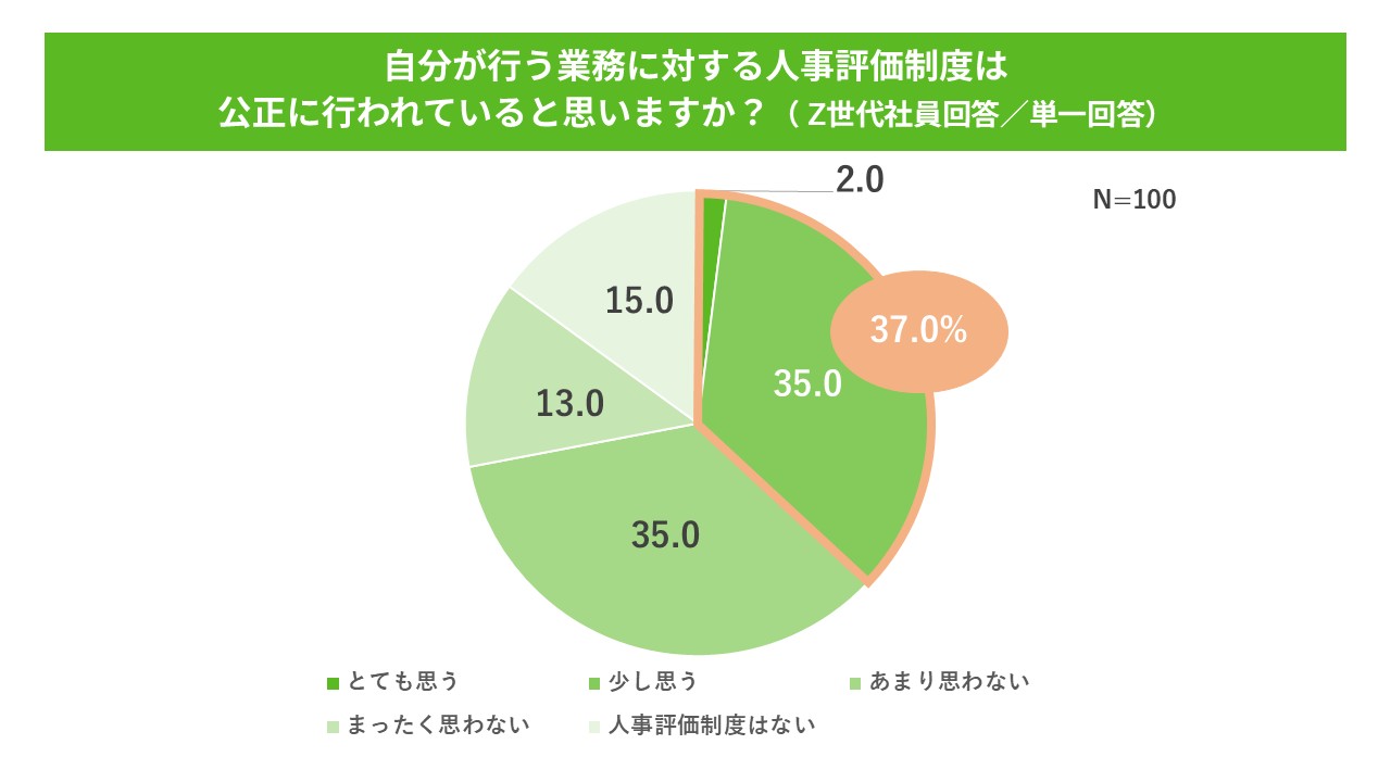 Z世代社員に対し、自分の業務に対する人事評価が公正だと思うかを聞いたところ、「とても思う」と「少し思う」を合わせると37.0%となった。