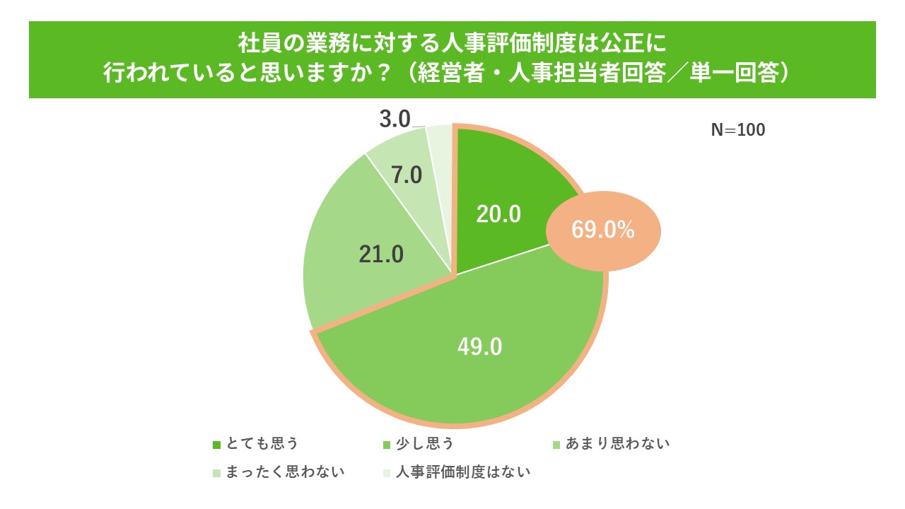一方、経営者・人事担当者側に対し、公正に人事評価が行えているかを聞くと、「とても思う」と「少し思う」を合わせると69.0%となり、公正な評価への実感値に大きなギャップがあることが分かった。このギャップは若手社員のモチベーション低下を招き、離職につながる可能性もあるという。