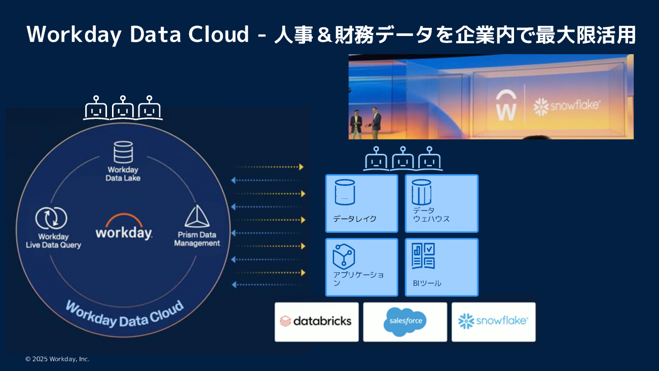 そのために同社は、オープンエンタープライズプラットフォーム「Workday Build」や、エージェントビルダー「Workday Flowise」、異なるソリューション間のデータをゼロコピーで活用できる「Workday Data Cloud」を用意。特にWorkday Data Cloudでは、Snowflake、Databricks[1]、Salesforceとパートナーシップを締結したことで、これらのシステムが持つ顧客データやビジネスデータをクリーンでガバナンスの保たれた状態でWorkday上で活用できるようになる。