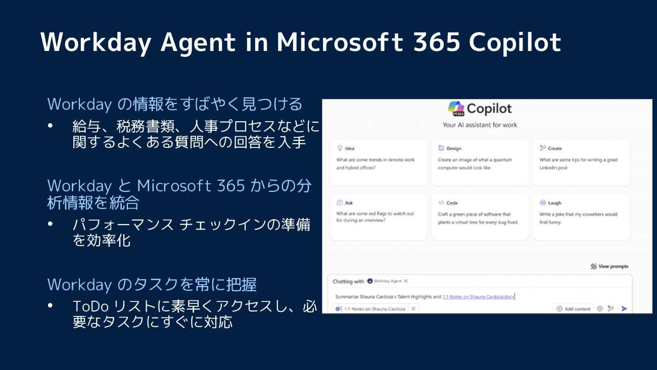 企業間の連携はこれだけにとどまらない。最後に同イベントでは、MicrosoftとGoogleとの連携も発表された。「Workday Agent in Microsoft 365 Copilot」では、Copilot上でWorkdayにある情報を参照できたり、AIエージェント同士を連携させたりできる。一例としてイベントでは、従業員のオンボーディング計画において、MicrosoftのCopilot上でオンボーディングエージェントを作成し、Microsoft Entra Agent ID[2]を使ってWorkday Agent System of Recordに登録、Workday上のAIエージェントと連携させることで、これまではマネージャーが行っていたオンボーディングのタスクを自動化するデモが披露された。また、Google Agentspaceでも同様の連携ができるという。