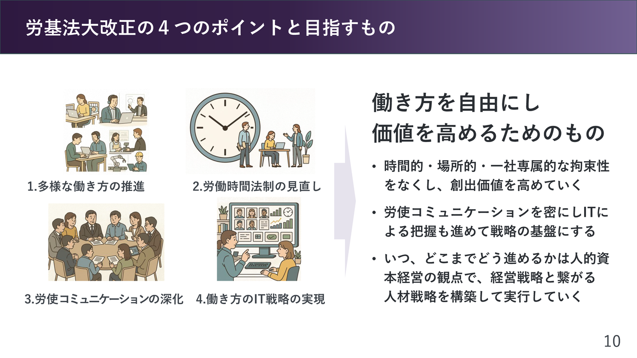 現在、2027年を目指して労基法の大改正が検討されています。「守らなければならない」最低基準を定める性質は今後も変わらない部分は多くありますが、法改正の具体的な予定内容を見ると大きな変化が見られます。それは「各企業での、戦略的な働き方の独自の設計を行うことが前提となっている内容が多く含まれている」ということです。