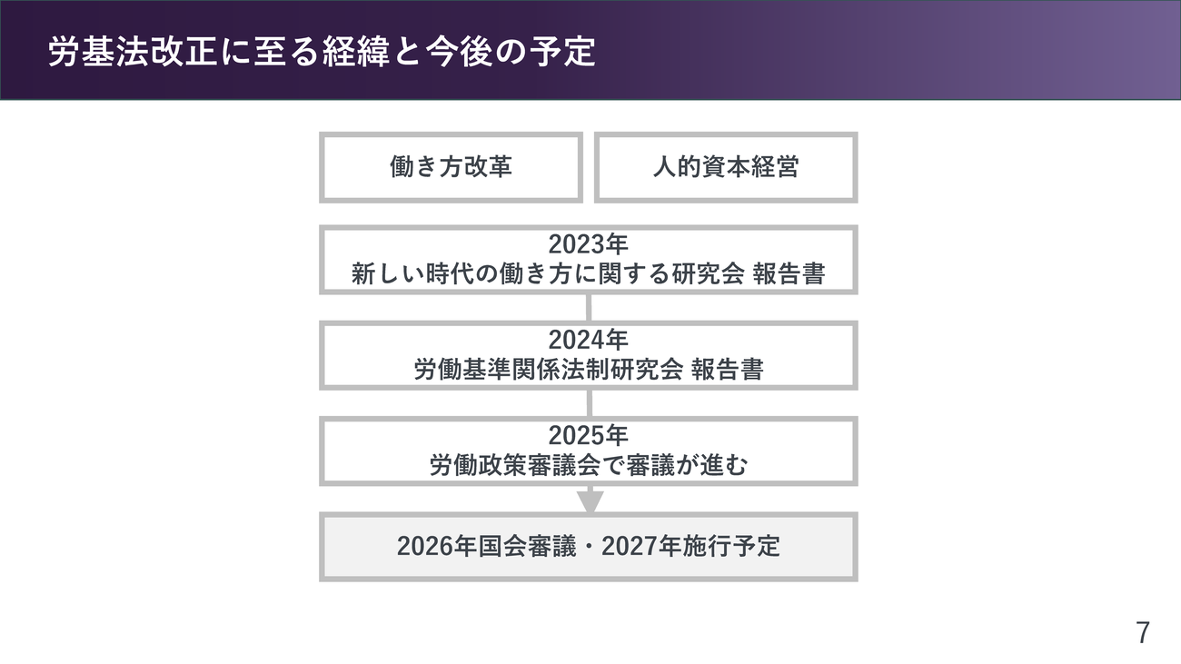 労基法改正については、2023年12月の「新しい時代の働き方に関する研究会 報告書」と2024年の「労働基準関係法制研究会報告書」という2つの重要な報告書に基づき、労働政策審議会で具体的な制度設計が進められています。