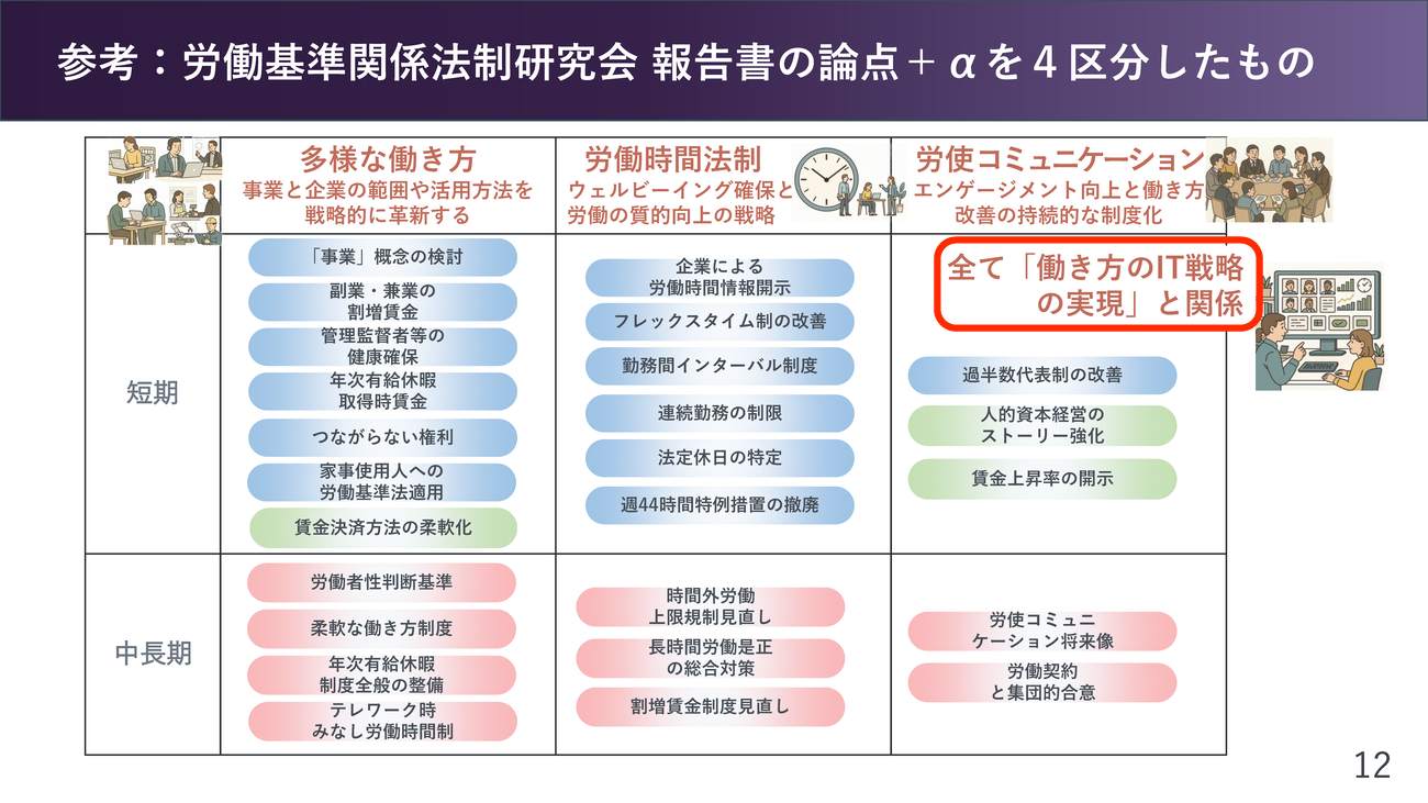第4の領域である「働き方のIT戦略の実現」は、第1・第2の領域で多様化・柔軟化した働き方を1人ひとりのレベルで可視化し、最適化していくデータに基づく労働管理の推進に関するものです。これ自体は法改正の具体的な論点ではないものの、報告書の複数の箇所で言及されている重要な論点です。