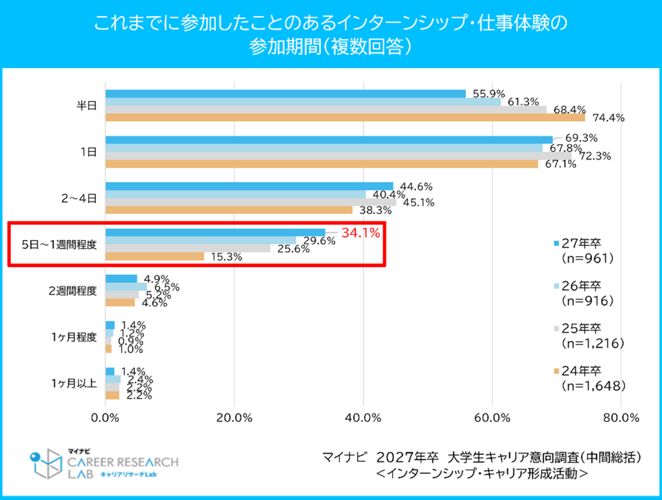 また、これまでに参加したことのあるインターンシップ・仕事体験の参加期間については「5日~1週間程度」が34.1%で、24卒から3年連続で増加している。