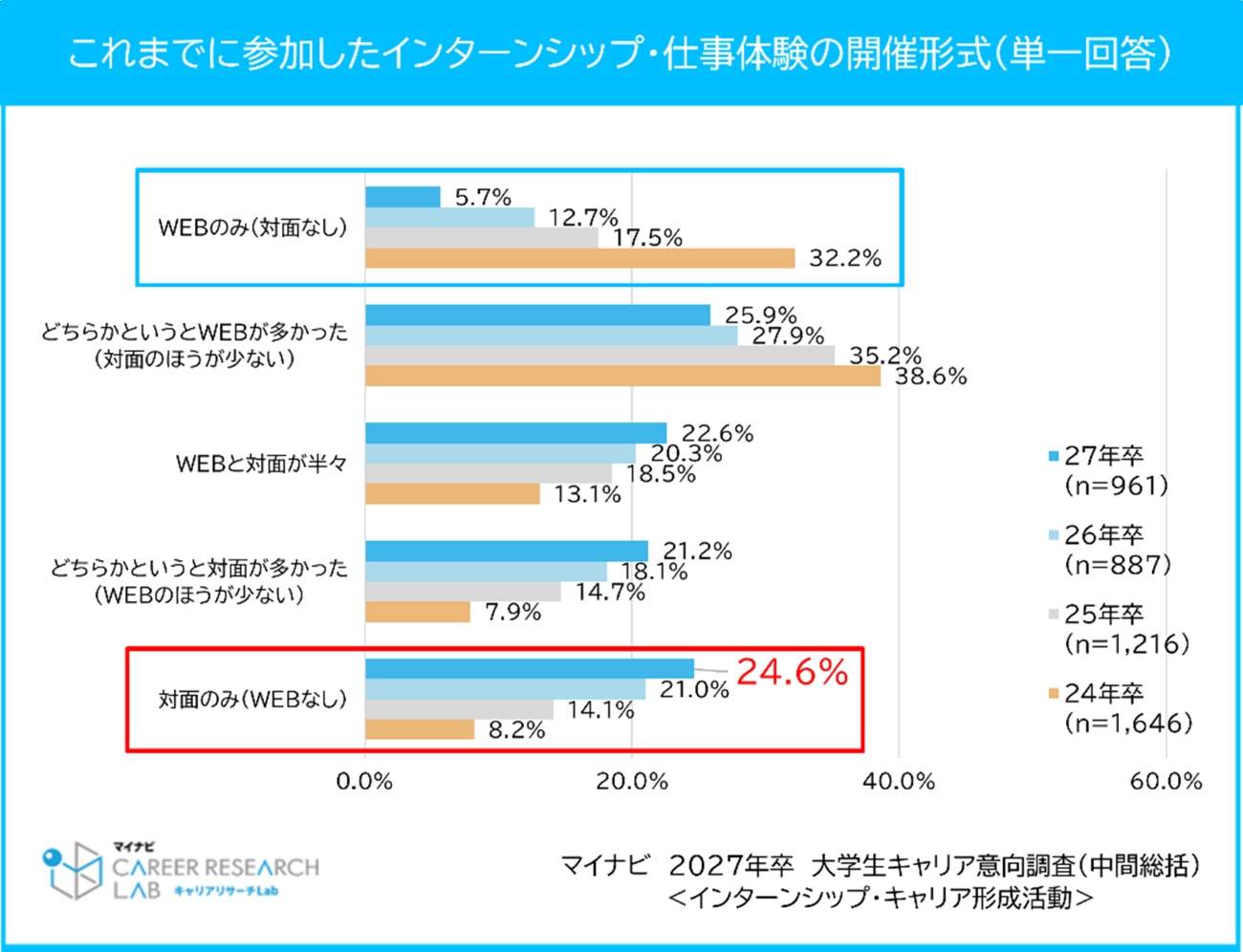 インターンシップ・仕事体験において「対面のみ」のプログラムに参加する割合が前年比3.6ポイント増