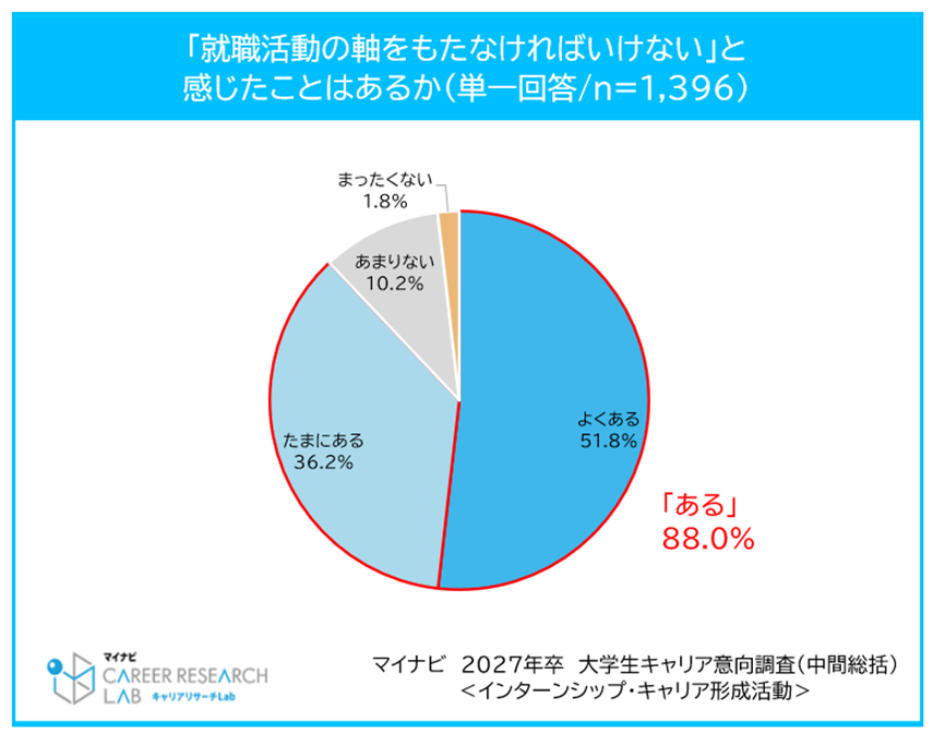 一方で、「就職活動の軸をもたなければいけない」と感じたことがあるかを聞いたところ、88.0%の学生が「ある」と回答した。