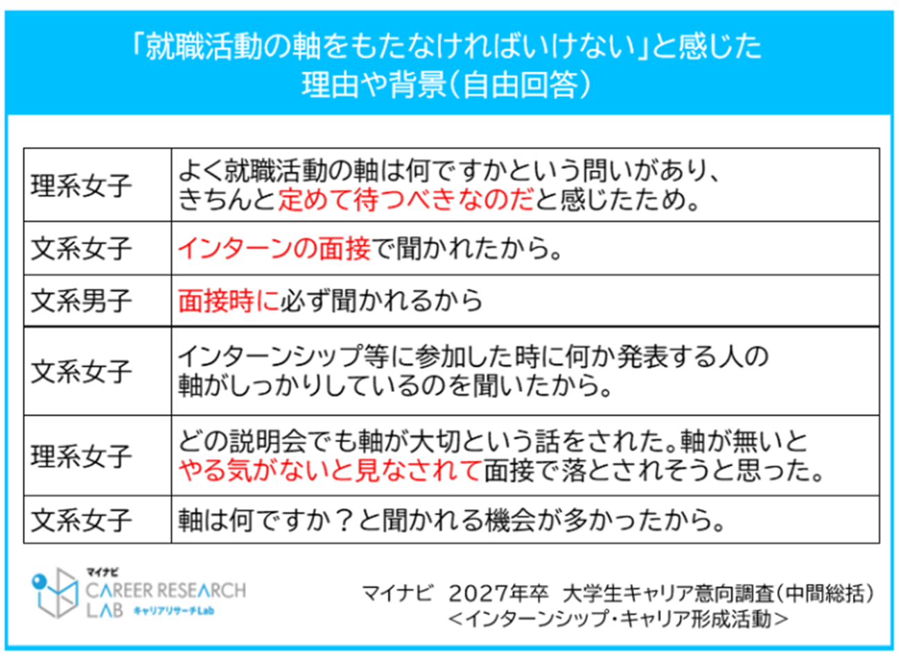 自由回答では、「よく就職活動の軸は何ですかという問いがあり、きちんと定めるべきなのだと感じたため」「インターンの面接時に必ず聞かれるから」「どの説明会でも軸が大切という話をされた。軸がないとやる気がないと見なされて面接で落とされそうと思った」とあり、まだ自己探索の途中である学生にとっては、早期に明確な軸を求められることが負担になっている可能性があるという。