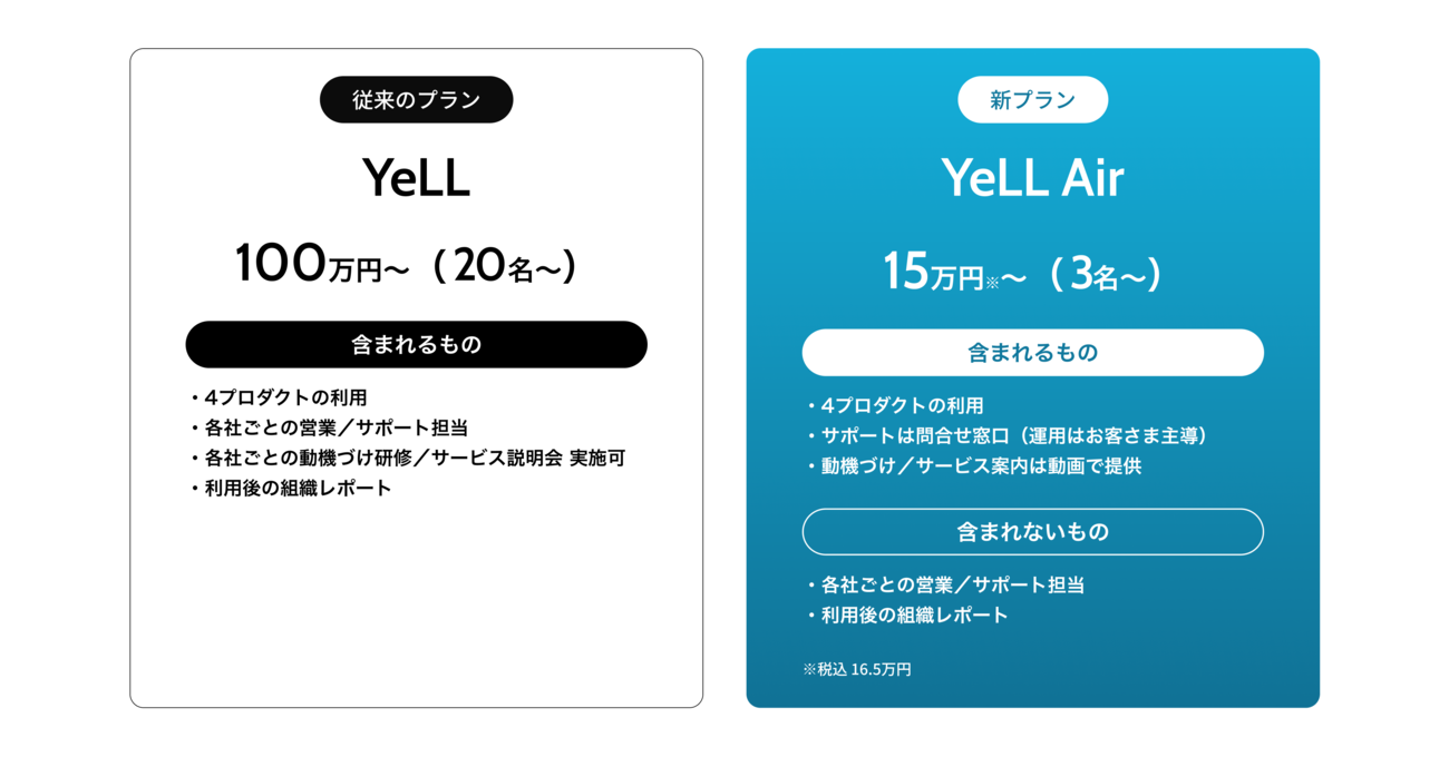 エールは、社外人材によるオンライン1on1サービス「YeLL」の新プラン「YeLL Air」を発表した。このプランでは、3名・15万円(税抜き)からサービスを利用開始できるため、従来の「YeLL」が20名以上の導入を前提としていたのに対し、より小規模な組織や少人数チームにとって導入しやすくなった。