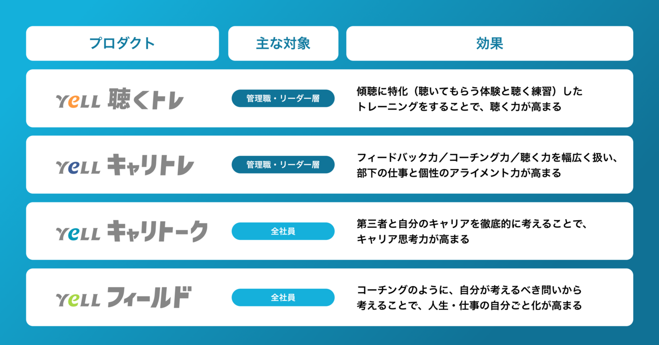 また、10年間大企業で活用されてきた4つのプロダクト「聴くトレ」「キャリトレ」「キャリトーク」「フィールド」は、YeLL Airでも利用できる。