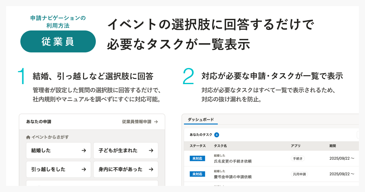 従業員の結婚や転居、出産などに伴う各種申請手続きは、申請漏れやミスが発生しやすく、担当者は類似の問い合わせ対応や申請内容の確認、差し戻し業務に多くの時間を費やしてきた。申請ナビゲーション機能は、従業員がホーム画面で該当イベントを選択し、ナビゲーションの指示に従って簡単な質問に答えるだけで、必要な申請やタスクを自動的にリストアップする。これにより、社内規則やマニュアルを調べる手間なく、必要な対応事項が「あなたのタスク」としてホーム画面に明示され、対応漏れを防止できるようになる。
