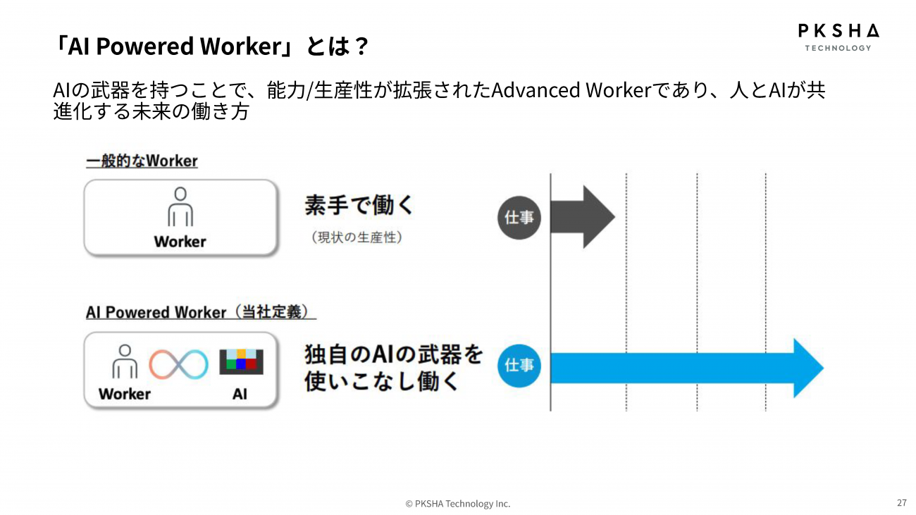 また、新しい事業領域として「AI Powerd Worker」を提唱。これは、人とAIが密に連携して働くことで、能力や生産性、その人が成し遂げたいことなどが拡張されるという考え方だ。