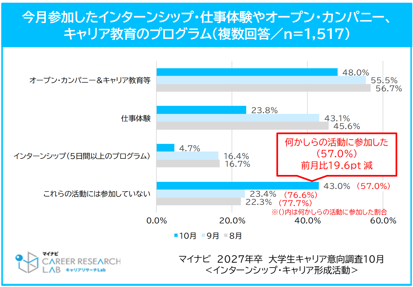 10月のキャリア形成活動に参加した学生の割合は57.0%で、前月より19.6ポイント減少となった。夏休み期間中は比較的自由な時間が多く、インターンシップや仕事体験などのキャリア形成活動に参加しやすい状況だったが、10月からは授業や課題が始まることから、キャリア形成活動の時間確保が難しくなったことが参加率低下の要因と推察される。