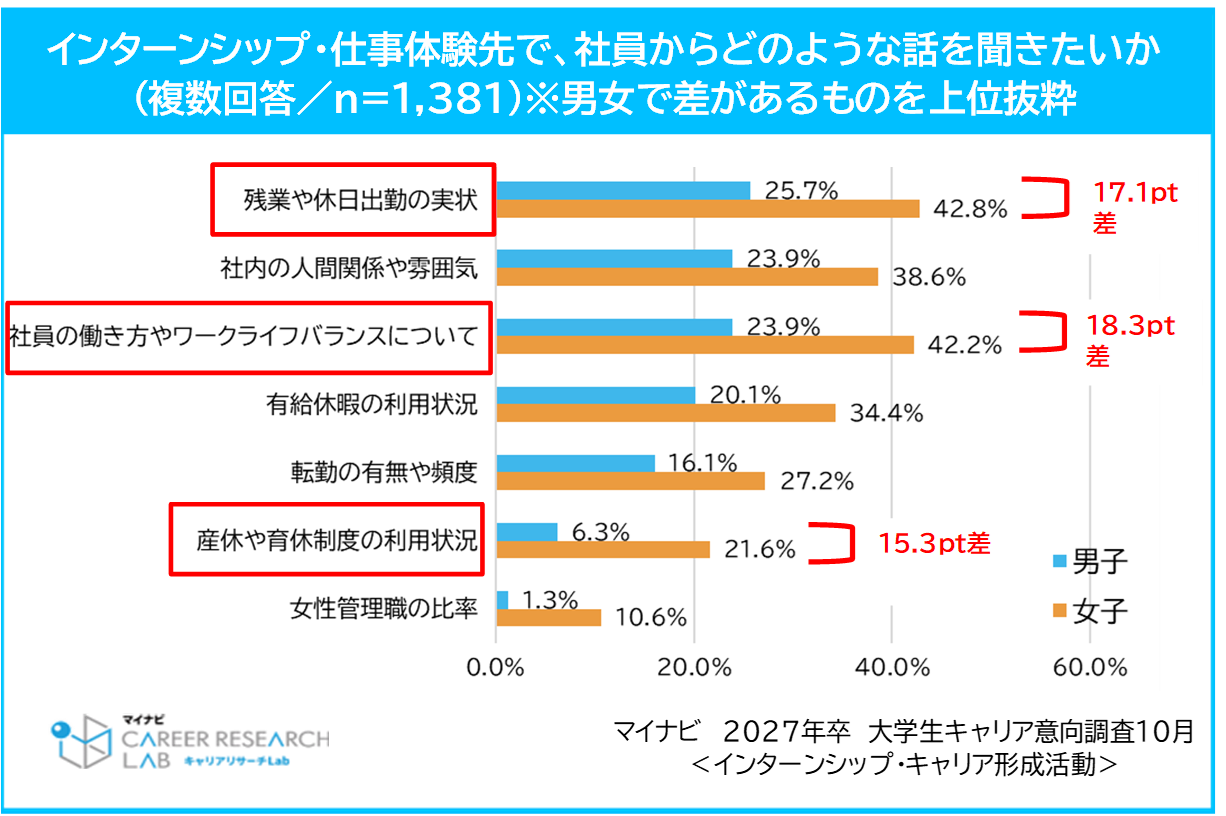 インターンシップ・仕事体験先で、女子のほうが働き方やライフイベントとの両立に関する情報を重要視
