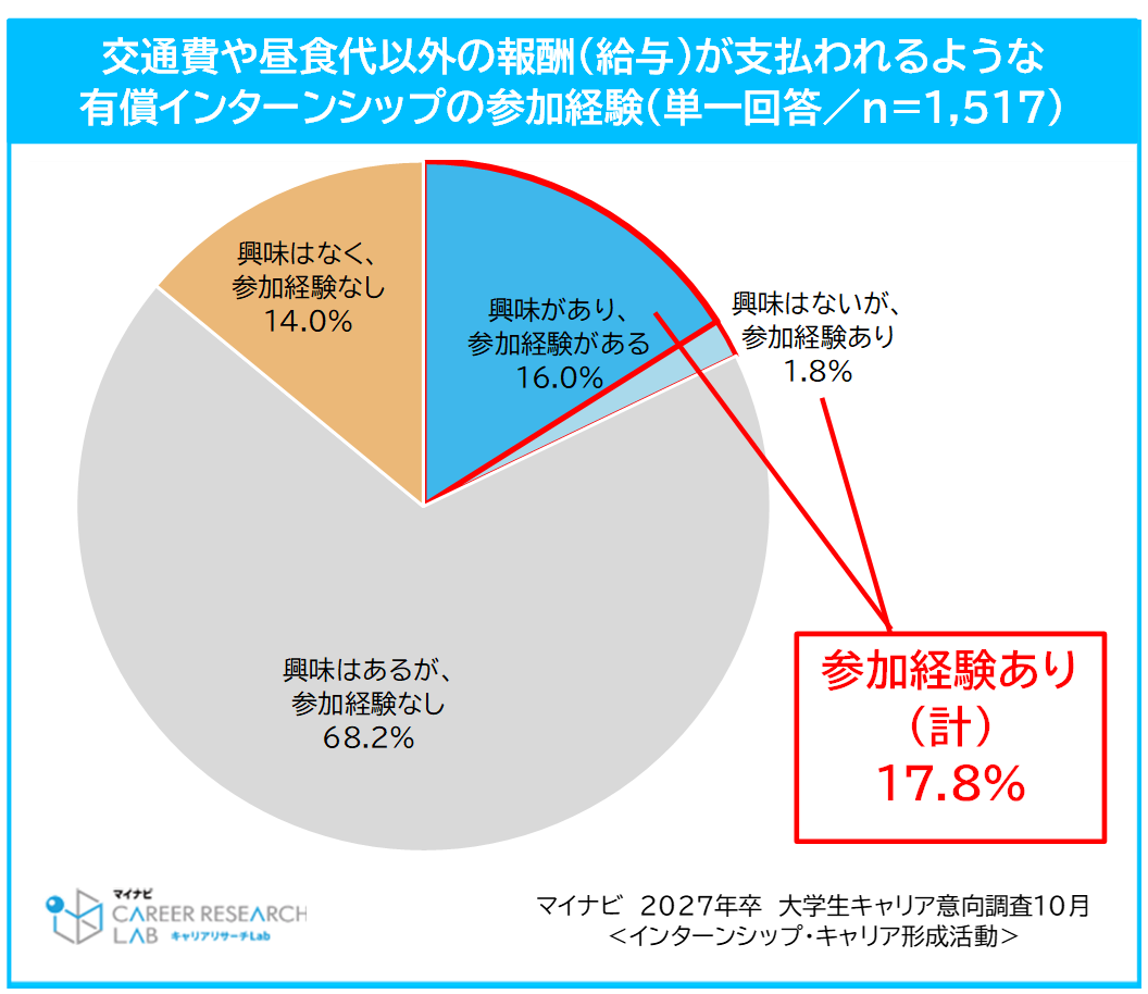 給与が支払われる「有償インターンシップ」の参加率は17.8%。実務性や責任感を伴う経験ができたという声も