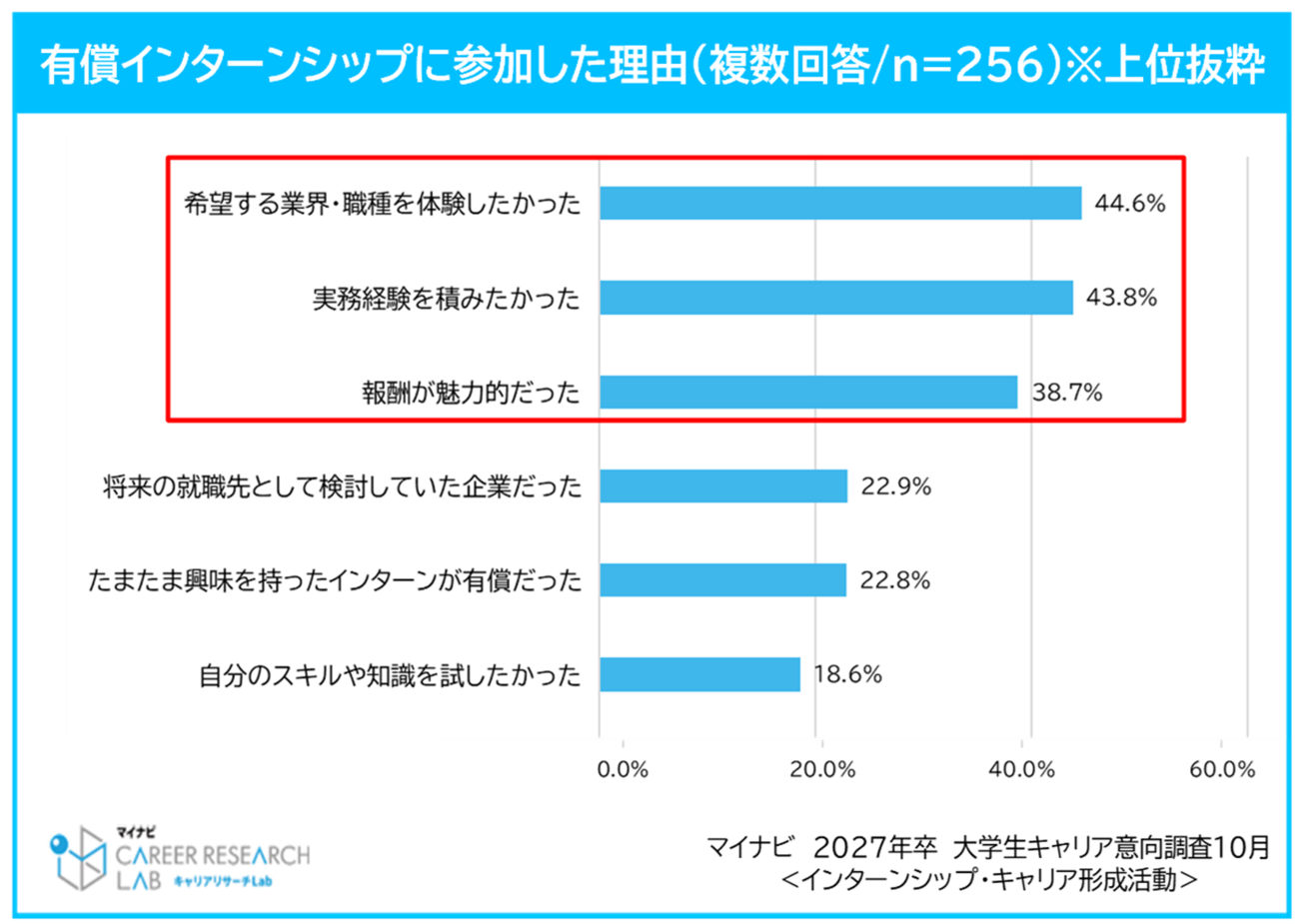 交通費や昼食代以外の給与が支払われるような「有償インターンシップ」に参加したことのある割合は17.8%だった。参加した理由を聞くと、「希望する業界・職種を体験したかった」(44.6%)が最多で、次いで「実務経験を積みたかった」(43.8%)、「報酬が魅力的だった」(38.7%)となった。
