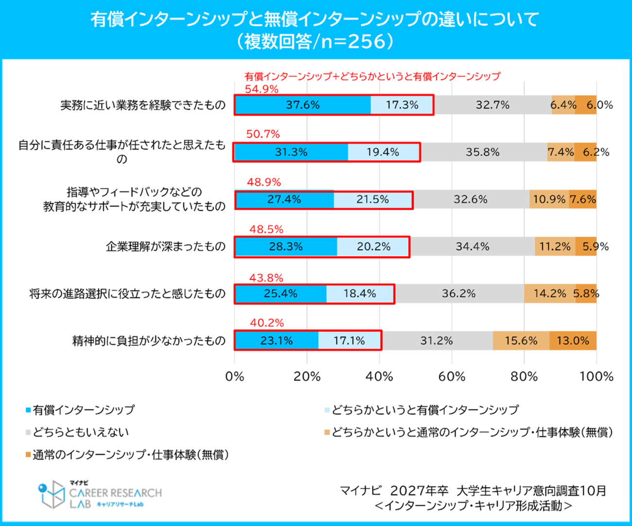 また、「有償インターンシップ」と「無償インターンシップ」の違いについて聞いたところ、「実務に近い経験ができたもの」(54.9%)が最多で、次いで「自分に責任ある仕事が任されたと思えたもの」(50.7%)、「教育的なサポートが充実していたもの」(48.9%)となったが、いずれの項目も「有償インターンシップ」が高い結果となった。
