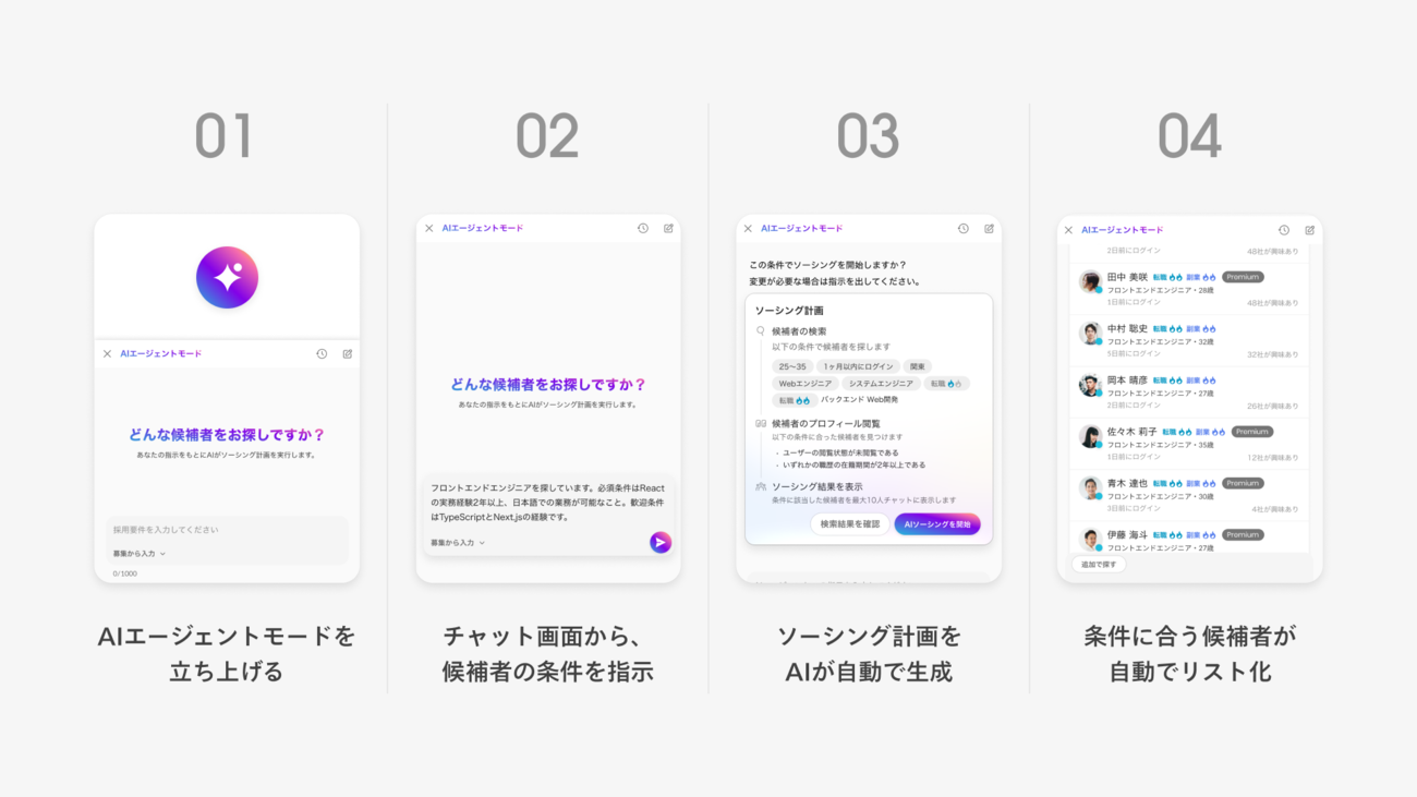 AIエージェントモードは、単純作業になりがちな一方で負荷が高い「候補者を探す」工程を代替し、採用担当者の慢性的な時間不足を解消。これにより、採用担当者が候補者1人ひとりと丁寧にコミュニケーションを取り、カルチャーマッチを見極めたりするための時間を創出する。