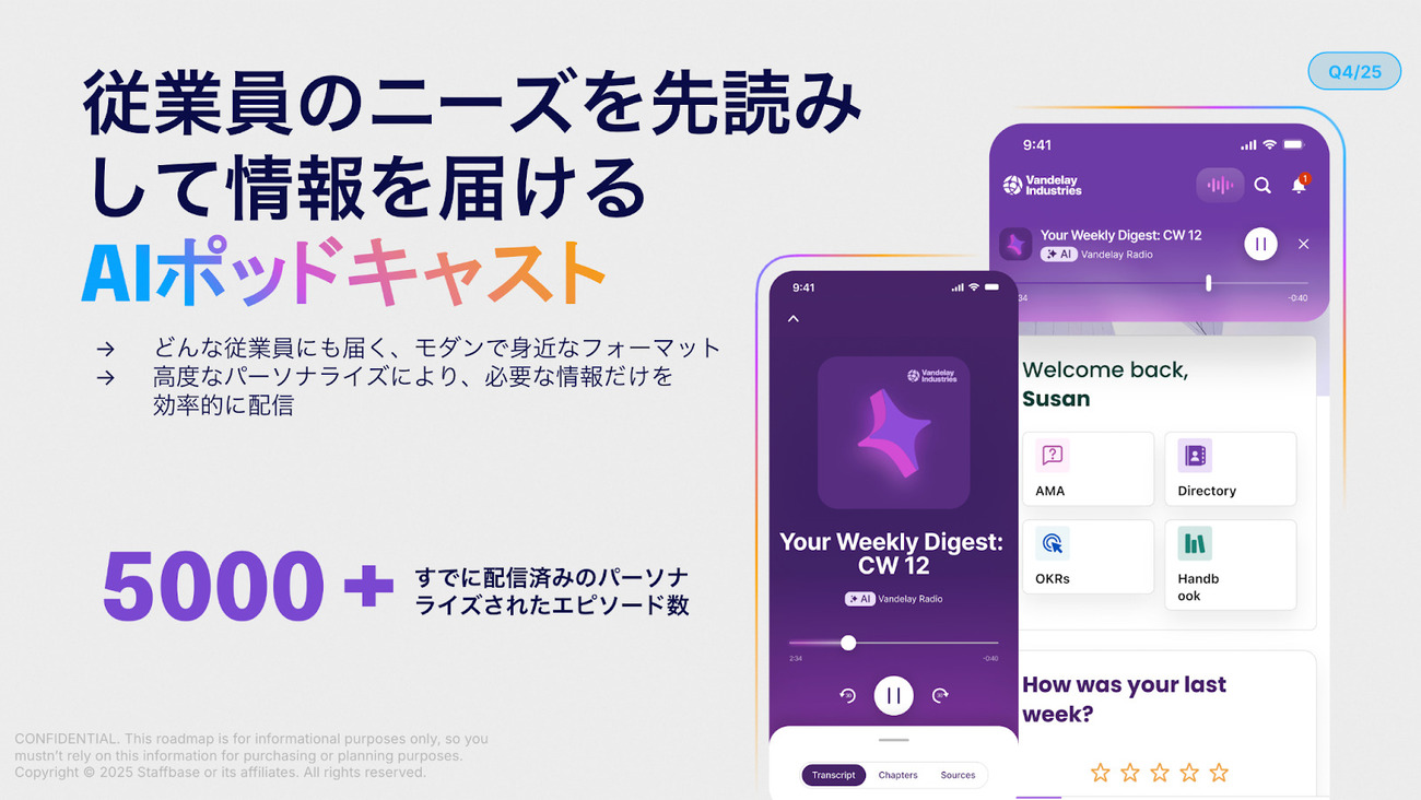 ①スマホで“聞くだけ”従業員ごとに最適化されたAI音声社内報「AIポッドキャスト」(2025年内予定)
