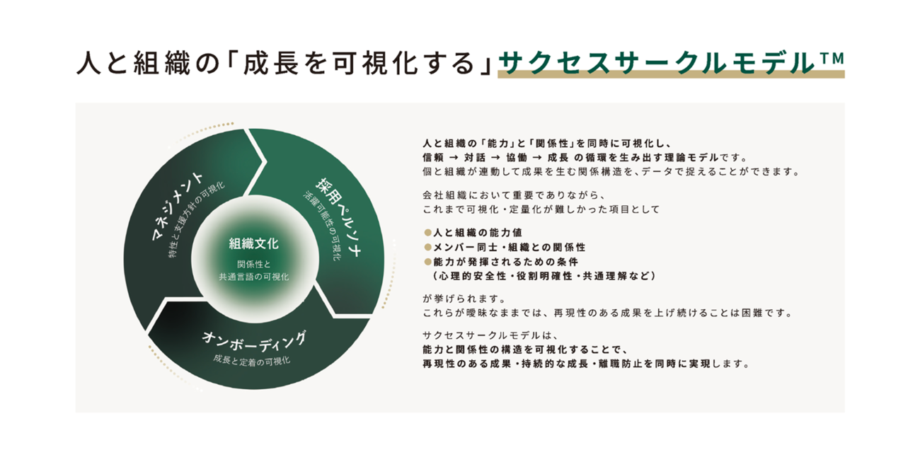 サクセスサークルモデルは、人と組織の「能力」と「関係性」を同時に可視化し、「信頼 → 対話 → 協働 → 成長」の循環を生み出す理論モデル。個と組織が連動して成果を生む関係構造を、データで捉えることができるという。