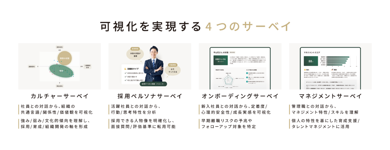 サクセスサークルモデルに基づいて人と組織の「能力」と「関係性」を可視化する場合、4つのサーベイを用いる。4つのサーベイは「採用 → 定着 → 成長 → 文化」という組織の成長循環にひも付けて設計しており、人と組織の一連の変化を1つの理論構造で可視化している。