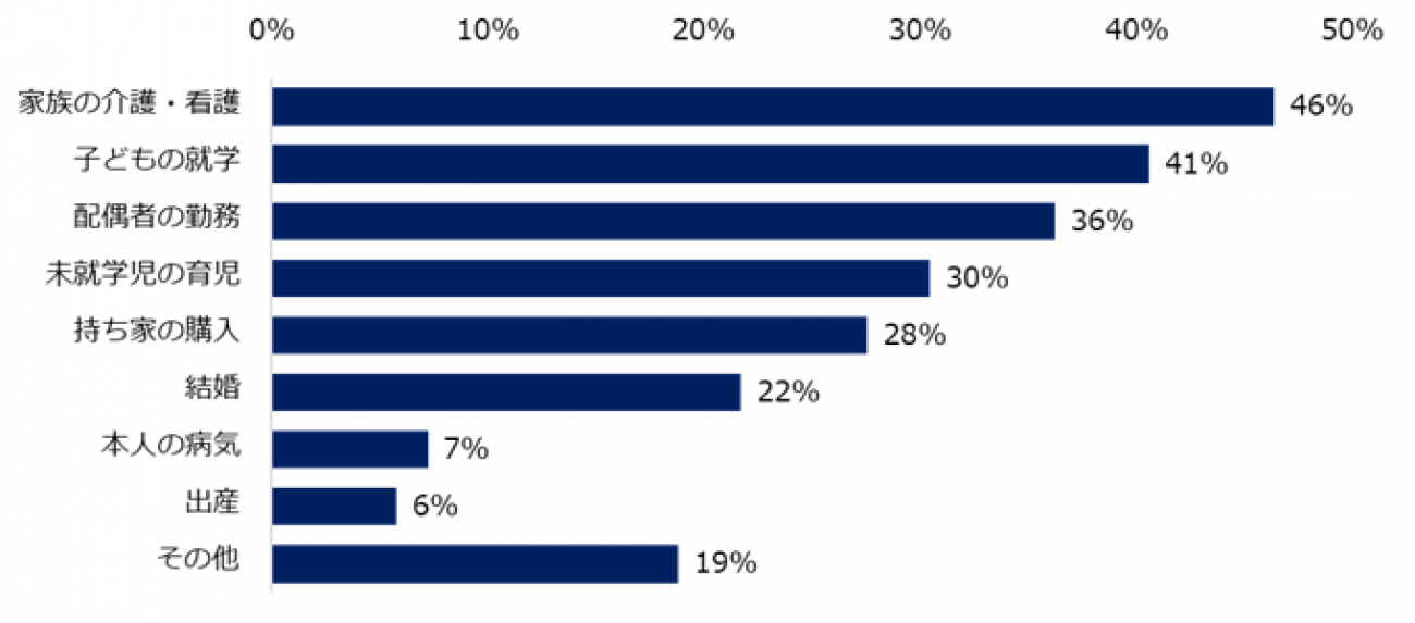 「配慮要望」「拒否」「退職」があったと回答した企業に、社員から伝えられた理由を聞いたところ、上位は「家族の介護・看護」(46%)、「子どもの就学」(41%)、「配偶者の勤務」(41%)で、多くの社員にとって家庭の状況が壁になっていることが分かった。