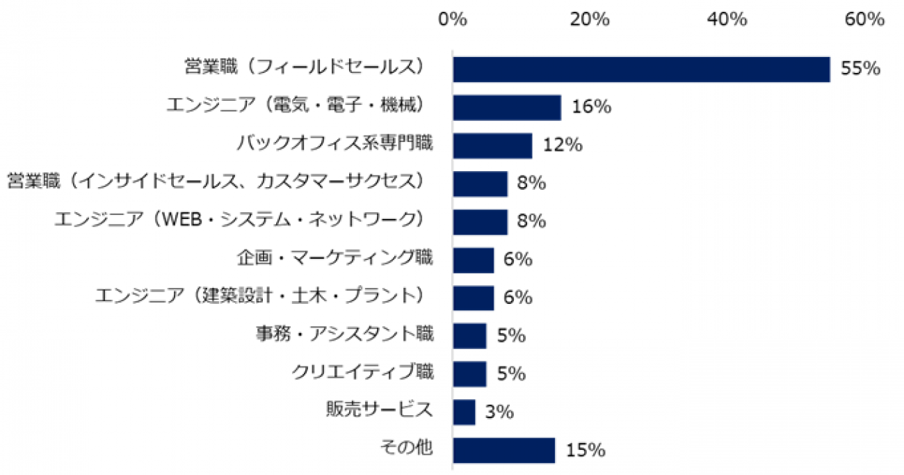 転勤制度があると回答した企業に、「転勤頻度が高い職種」を質問した。トップは、「営業職(フィールドセールス)」(55%)で、次点の「エンジニア(電気・電子・機械)」(16%)と39ポイントの開きがあった。