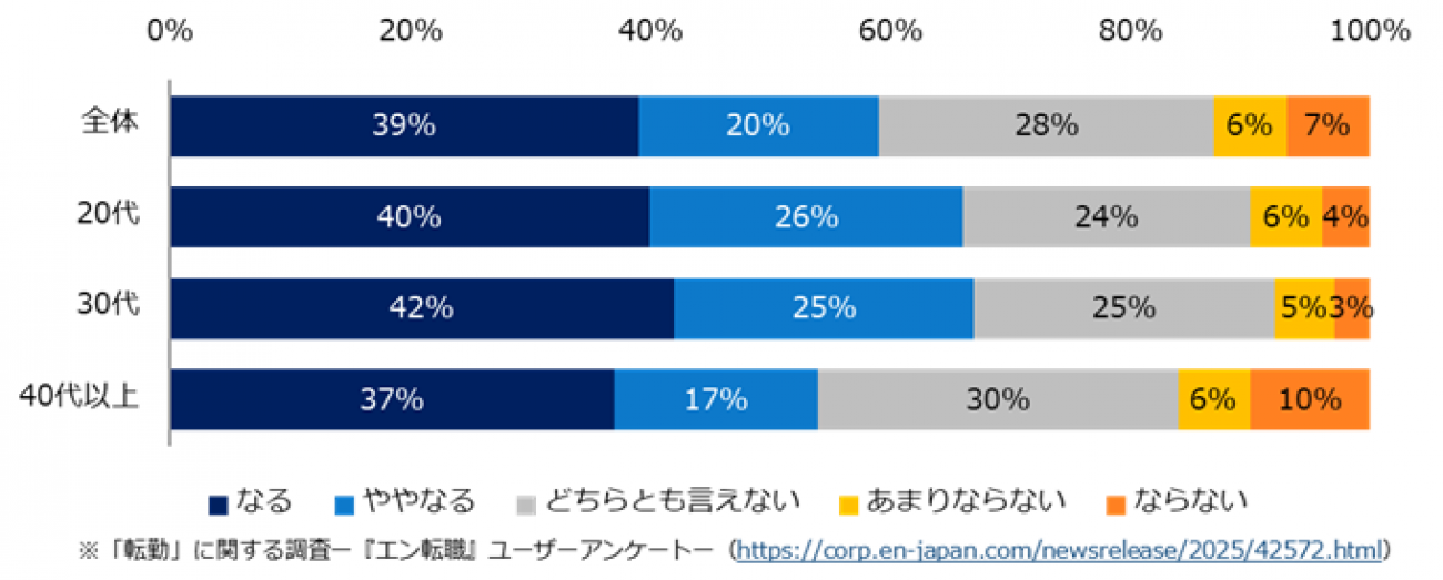 2025年6月、「エン転職」のユーザーに転勤に関する意識調査を実施したところ、約6割が「転勤の辞令が出た場合、退職を検討するきっかけになる」と回答した。