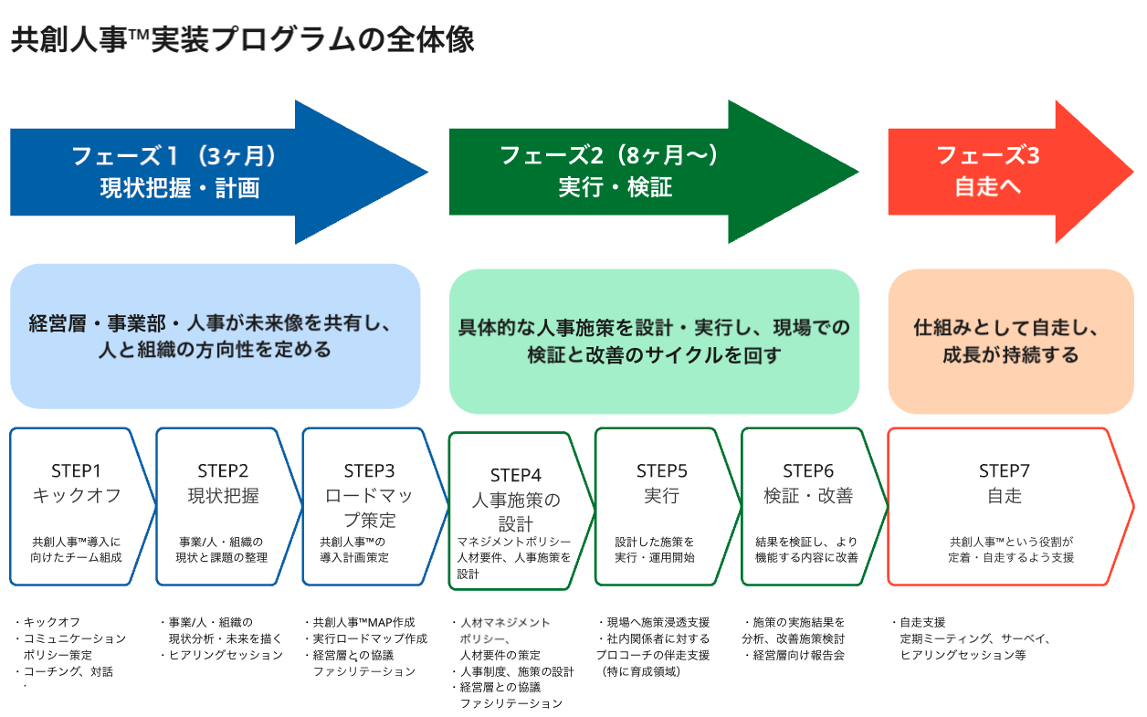 同プログラムは3段階のフェーズで構成。これにより「経営の想いが現場に届き、人が自ら動き、戦略が実現する共創型組織」へと進化させていく。