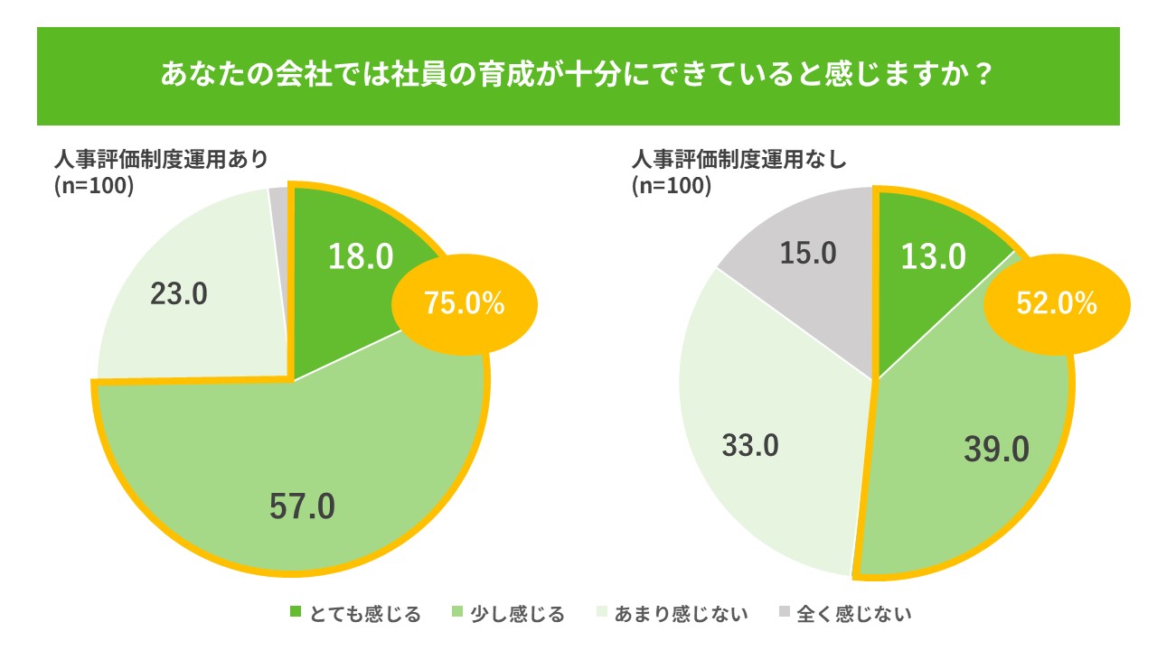さらに、社員の離職原因を把握している割合にも差が見られた。制度運用企業では理由を把握できている一方、未運用企業の44%が「わからない」と回答しており、経営層と従業員間のコミュニケーション不全が課題として浮上した。目標を持って業務に従事する社員の割合も、制度運用企業が83%で未運用企業の60%を大きく上回った。社員育成についても、制度運用企業の75%が「十分にできている」と考えており、未運用企業の52%との差がみられた。