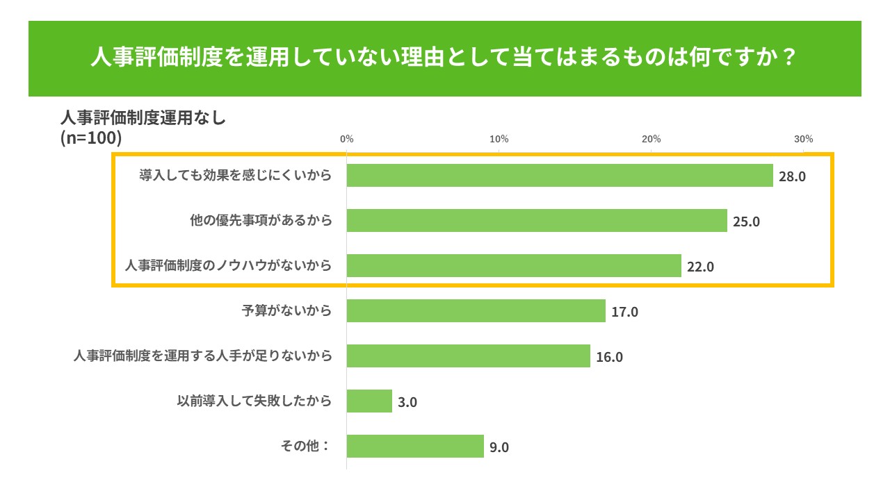 人事評価制度を導入しない理由として多かったのは「導入しても効果を感じにくいから」(28%)や「他の優先事項があるから」(25%)、「ノウハウ不足」(22%)であった。経営計画の運用に関しても運用企業の82%が経営計画を併用しているが、未運用企業では30%にとどまった。