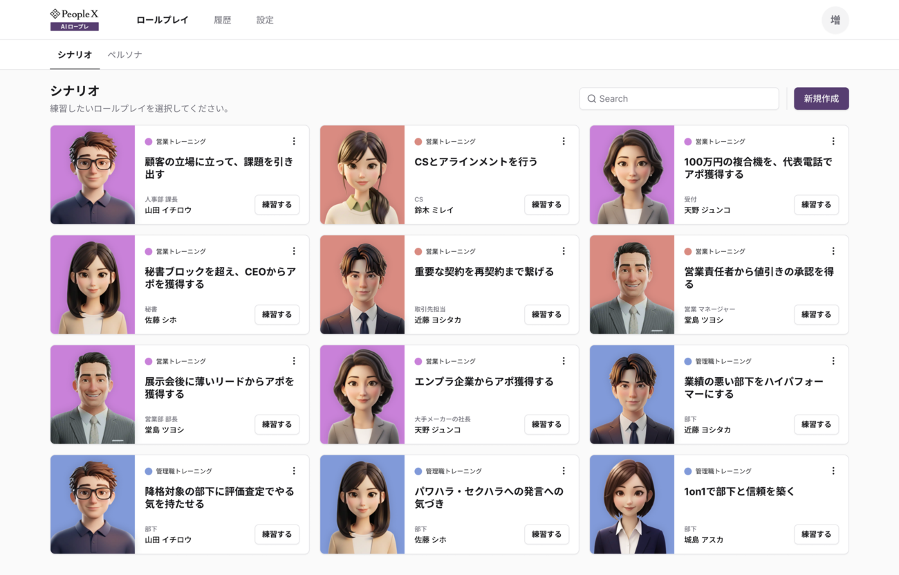PeopleX AIロープレはAIによる実践的なロールプレイングが可能で、営業や顧客対応、社内での1on1や会議、プレゼンテーションの練習まで幅広く対応。24時間365日利用可能で、時間や場所に縛られず個人のペースでトレーニングできる。また、AIが公平な評価を行うため、育成内容や評価のばらつきが少なくなり、組織全体への均一な教育が実現する。