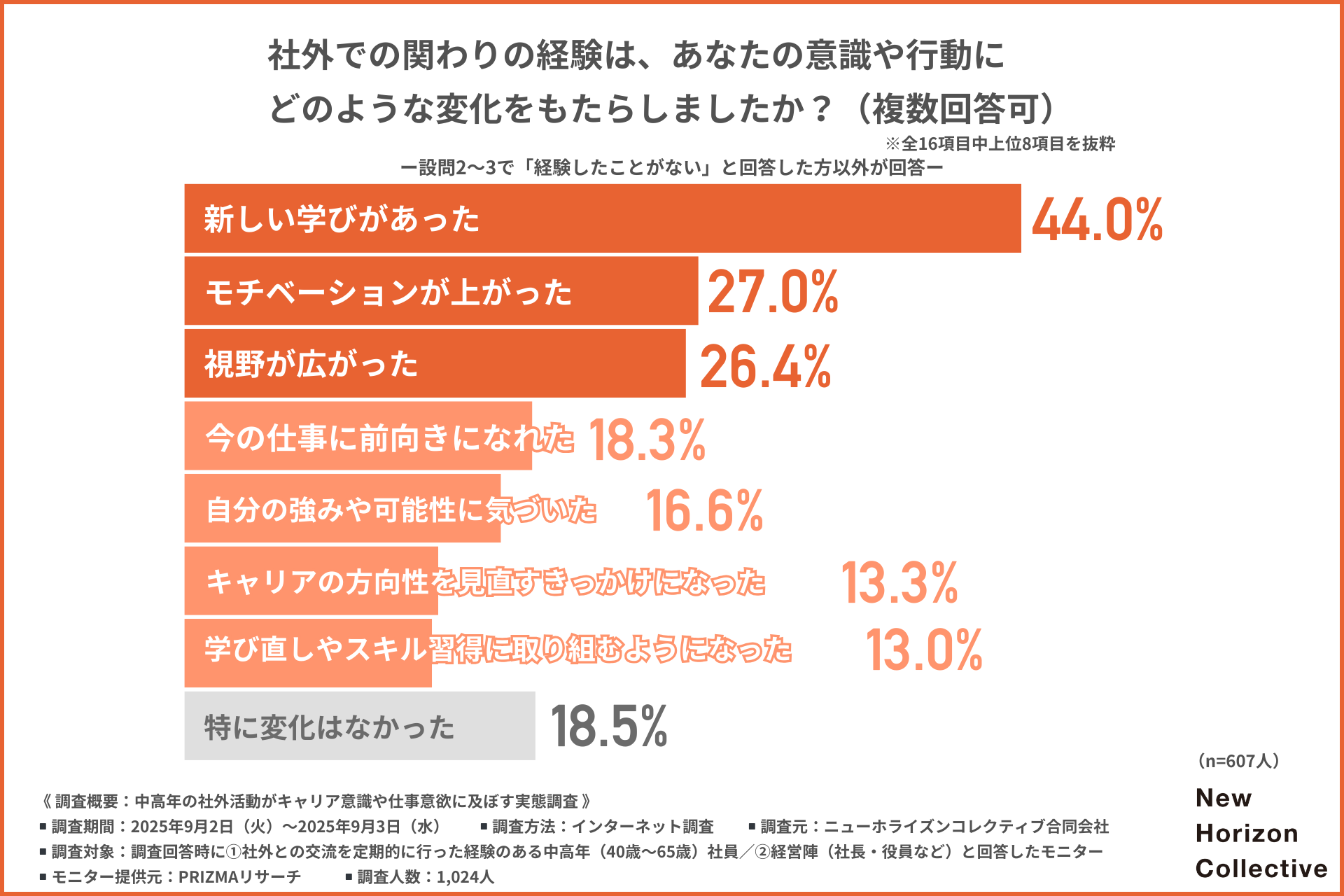 ニューホライズンコレクティブは、中高年層(40歳~65歳)の社員と経営陣を対象に、社外活動がキャリア意識や愛社精神に与える影響に関する実態調査を実施。その結果を発表した。