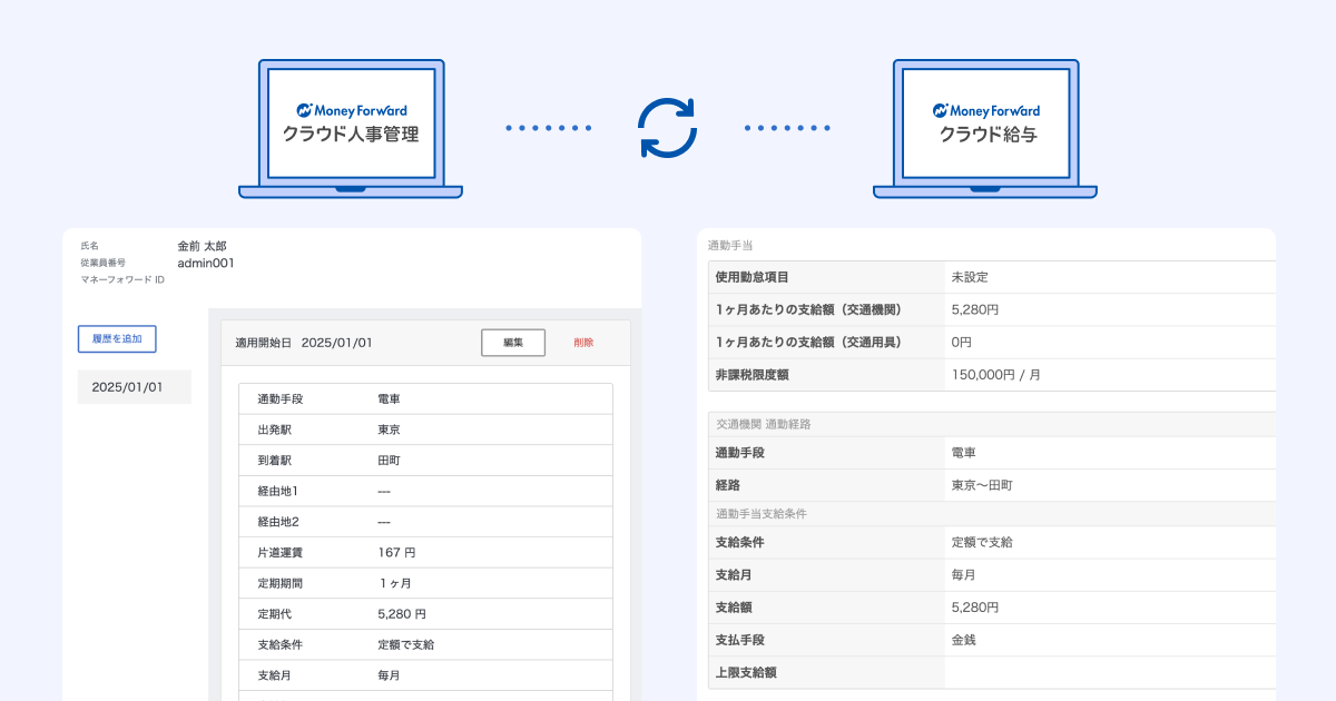 「クラウド給与」では、「クラウド人事管理」から連携できる項目が増え、各通勤経路ごとに支給条件や支給間隔を設定できるようになった。これにより、たとえば1人の従業員に対して、電車代は6ヵ月ごと、バス代は3ヵ月ごとといった複数の経路・条件で通勤手当の計算が可能となる。