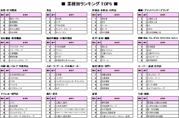 「医薬品・化粧品・日用品」では、中外製薬が前年の10位から5位に上がり、医薬品で唯一ランクイン。「輸送用機器・自動車関連」では、アイシンが前年の10位から2位にジャンプアップし、3位のデンソーともにトヨタ系部品メーカー2社が並び、日産自動車、SUBARUは圏外へ。「鉄鋼・金属・ゴム・ガラス・セラミックス・セメント」は、米鉄鋼大手USスチールの買収が話題となった日本製鉄がトップに躍り出た。「スーパー・流通・百貨店」では、ファミリーマートが前年の8位から2位へ。「銀行・信金」では、三菱UFJ信託銀行が前年8位から5位に信託銀行で唯一ランクイン。「生保・損保」は、三井住友海上火災保険(前年6位→2位)、大同生命保険(同9位→4位)の2社が入った。「商社(総合・専門)」と「証券」は顔ぶれ、順位とも不動であった。