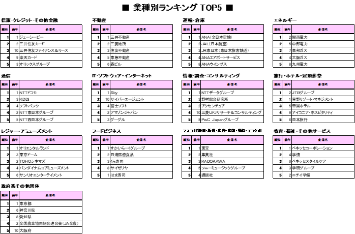 「信販・クレジット・その他金融」では、三井住友ファイナンス&リース(前年10位→3位)と楽天カード(同9位→4位)がランクイン。「エネルギー」は前年トップの東京ガスが圏外となり、関西電力が2位から1位に。東邦ガス(同7位→3位)、九州電力(同8位→5位)が入った。「IT・ソフトウェア・インターネット」では、サイバーエージェントが前年10位から2位へジャンプアップ。「情報・調査・コンサルティング」は、三菱UFJリサーチ&コンサルティングが前年10位から4位入り。唯一すべての順位が入れ替わり変動が大きかったのが「旅行・ホテル・冠婚葬祭」。前年トップの星野リゾート・マネジメントと2位だったJTBグループの順位が入れ替わり、アイコニア・ホスピタリティ(同9位→4位)、日本旅行(同6位→5位)がランクインした。「フードビジネス」は、前年7位のすかいらーくグループがトップとなり、サイゼリヤが8位から4位に。「政府系その他団体」は大都市を抱える3団体が新たにランクインした。