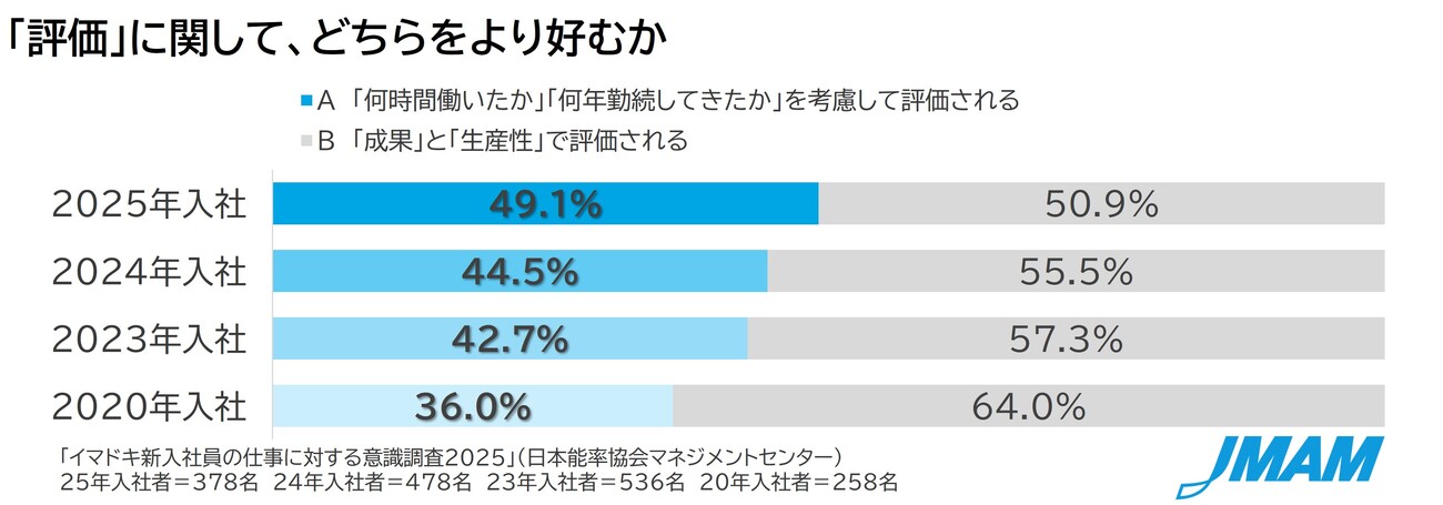 今回の調査では、「現在の会社で働き続けたい」と回答した新入社員の割合が70.9%となり、調査開始以来最高値を記録した。過去20年と比較しても21ポイント増加しており、就社志向の高まりが鮮明となった。新入社員の73.8%は「今の会社の事業の中で成長したい」と考えており、組織の中で長期的に自分のキャリアを積みたい意向が強く表れた。同時に、評価については「成果や生産性」よりも「働いた時間や勤続年数」を重視する声が年々増えている。また、自律的なキャリア開発意識は2022年の89.2%から今回の調査では65.3%に減少しており、安定した雇用環境下での成長支援の必要性が指摘されている。