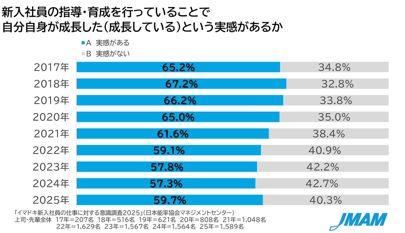 同調査では、新入社員側と指導者側の意識差にも注目が集まった。新入社員の48.1%は希望しない部署や勤務地への配属、いわゆる「配属ガチャ」を感じている。一方、上司・先輩社員の67.3%が「新人ガチャ」、すなわち配属された新入社員の“当たり外れ”を実感していると回答した。採用競争の激化や人材不足を背景に、現場で育成にあたる育成担当者の負担感が高まっている。実際、育成担当者が「新人指導を通じて成長を感じる」と答えた割合は59.7%で、2018年をピークに低下傾向にある。こうした現場の「育成疲労」が組織全体の課題となっている。
