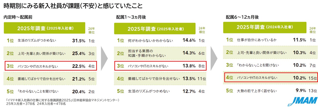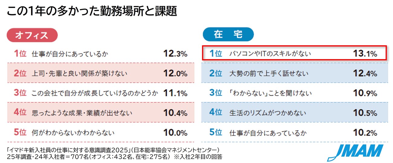 加えて、「デジタルネイティブ」といわれる新入社員であっても、ビジネス現場で必要となるITスキルの不足が顕著になっている。配属前後の課題・不安として、「パソコンやITのスキルがない」が上位に挙げられ、入社1年目の主な勤務先が「在宅」だった新入社員では最も大きな課題となっている。新入社員の57.7%は「生成AIの指導の方が効率的」と回答し、AI活用への順応性は高いものの、基礎的なビジネスITスキル習得の支援が急務であることが明らかになった。