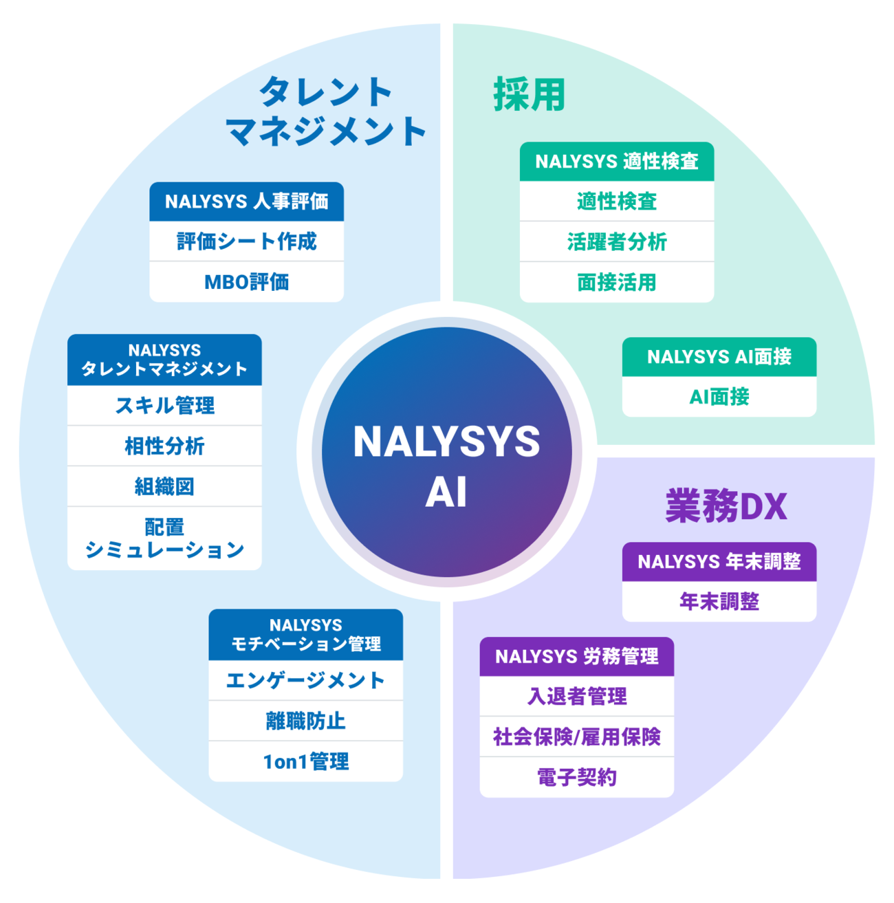 NALYSYS タレントマネジメントは「データとAI」を中核に据え、組織と人材づくりを戦略的に支援する“AI人事プラットフォーム”構想を推進。従来の人事現場で見られた、経験や属人的な判断に頼った業務運用、意思決定のブラックボックス化といった課題を解消し、AIとデータを活用した透明性の高い意思決定を支援する。