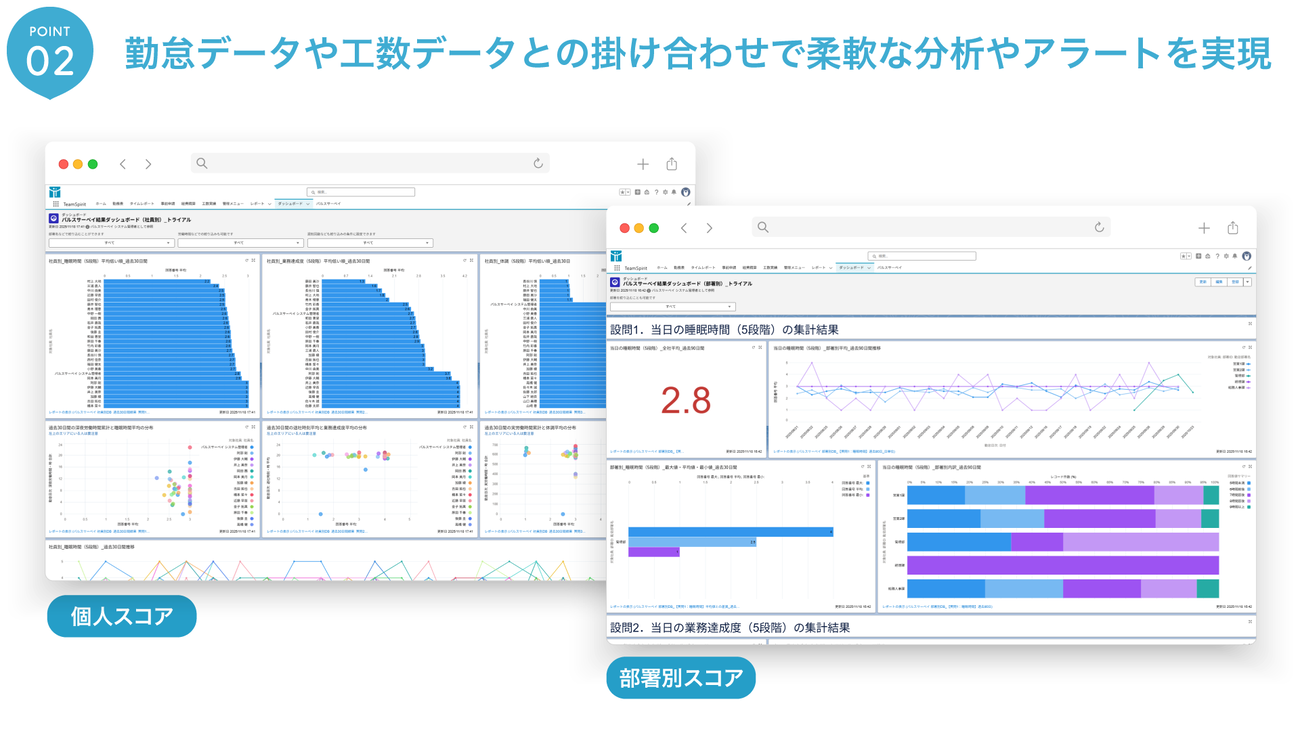 収集されたデータはSalesforce基盤上に統合。TeamSpiritに蓄積された「勤怠データ(残業時間・休日出勤)」や「工数データ(業務負荷や日報内容)」などと組み合わせて分析できる。
